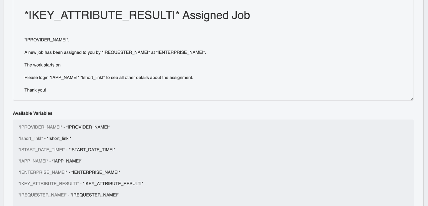 To use a variable in the template, copy the light grey text and paste the specific one you are needing into either the subject line or the body of the text.
