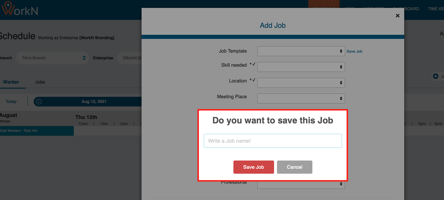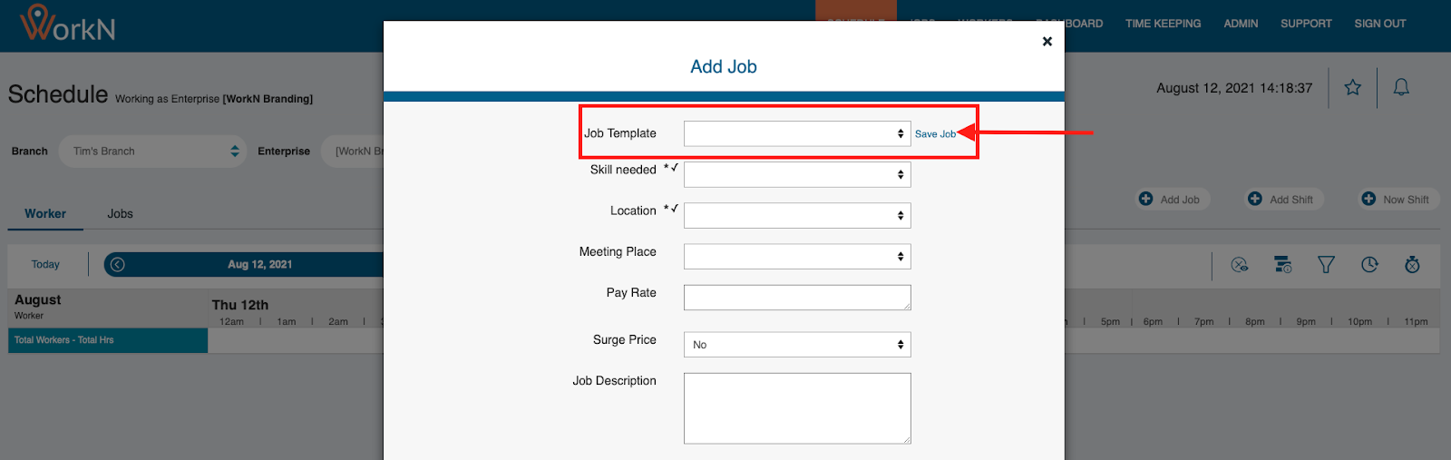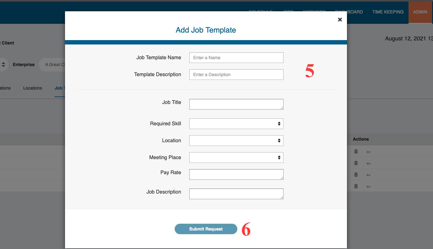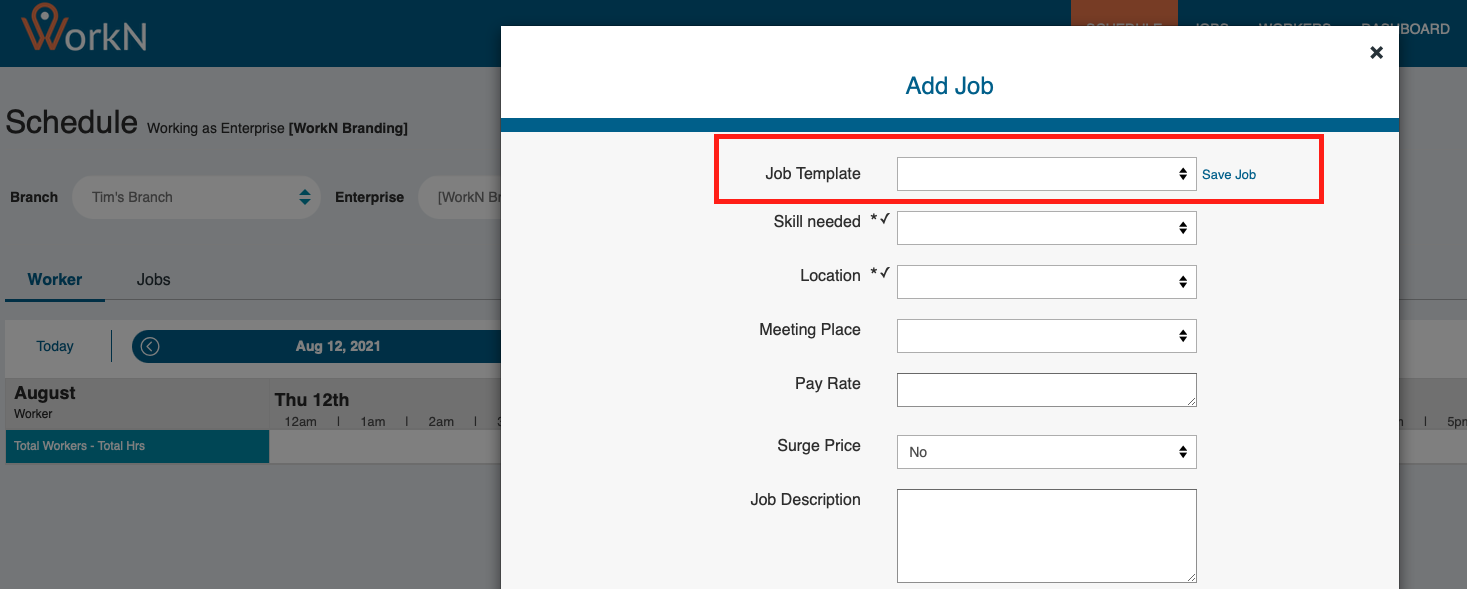 Job templates can be created within your admin panel on the web. Here you will determine which skills/positions, locations, and meeting places are defined in a specific job type. Job Templates can be reused when scheduling a job to help auto-populate the fields needed to create a job.