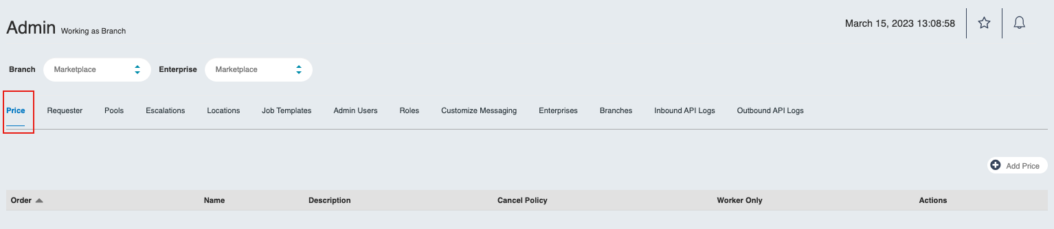 From within the Admin tab in WorkN, navigate to and select Price from the subtabs.