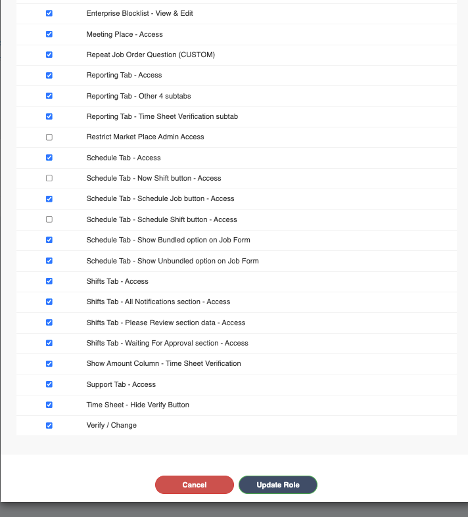 When this privilege is disabled for a user, they will not see the Mass Cancel Button and when canceling a single shift, the Warning Screen asking if they want to cancel all remaining shifts in a job will not be displayed.