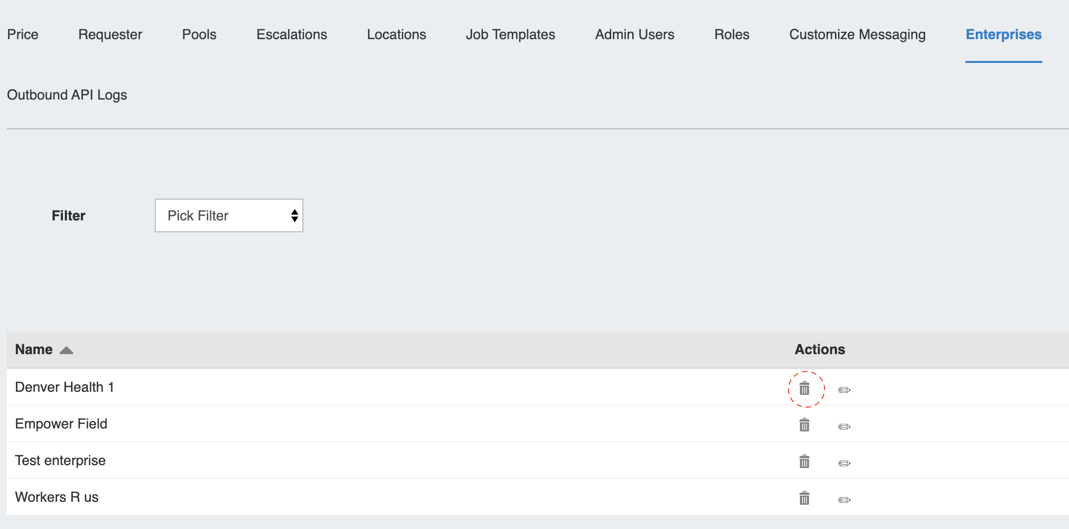 Admin Tab – Enterprise Subtab - Delete