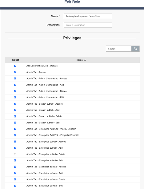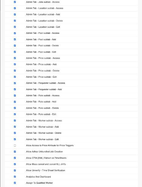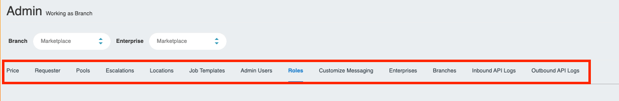 - Sub Tabs permissions include Price, Requester, Pools, Escalation, Locations, Job Templates, Admin Users, Roles, Customize Messaging, Enterprises, and Branches