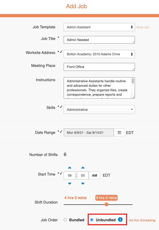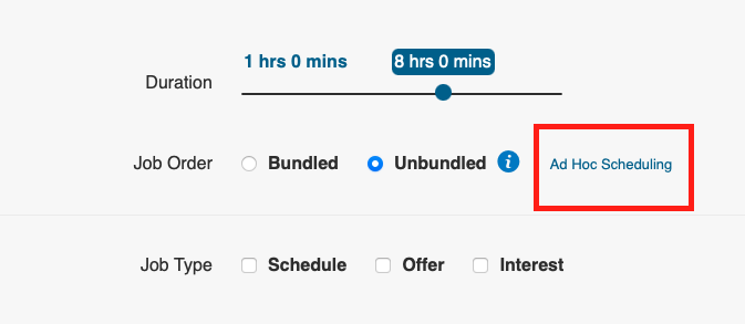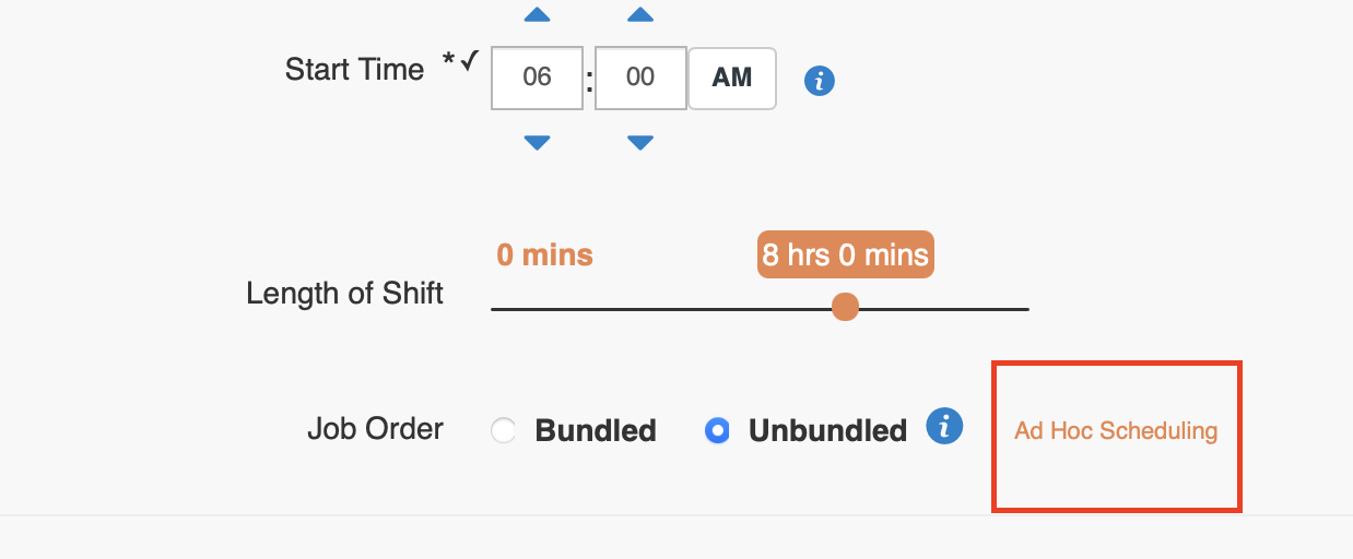 Ad Hoc Scheduling allows creation of multiple shifts with different start/end times within a single unbundled job order.