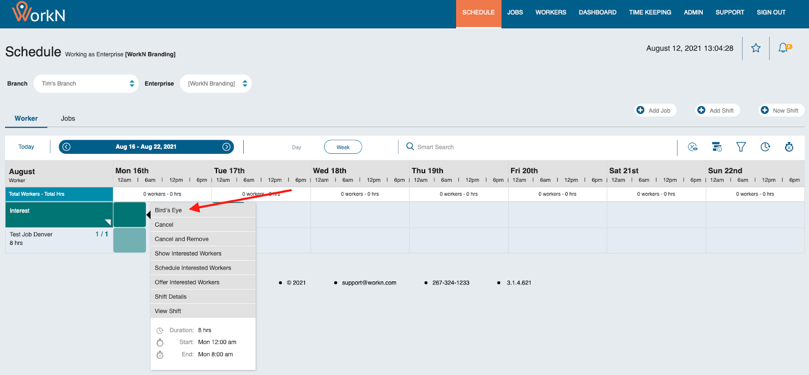For complex scheduling needs, the Birds Eye View provides a visual interface for assigning workers to specific shifts.