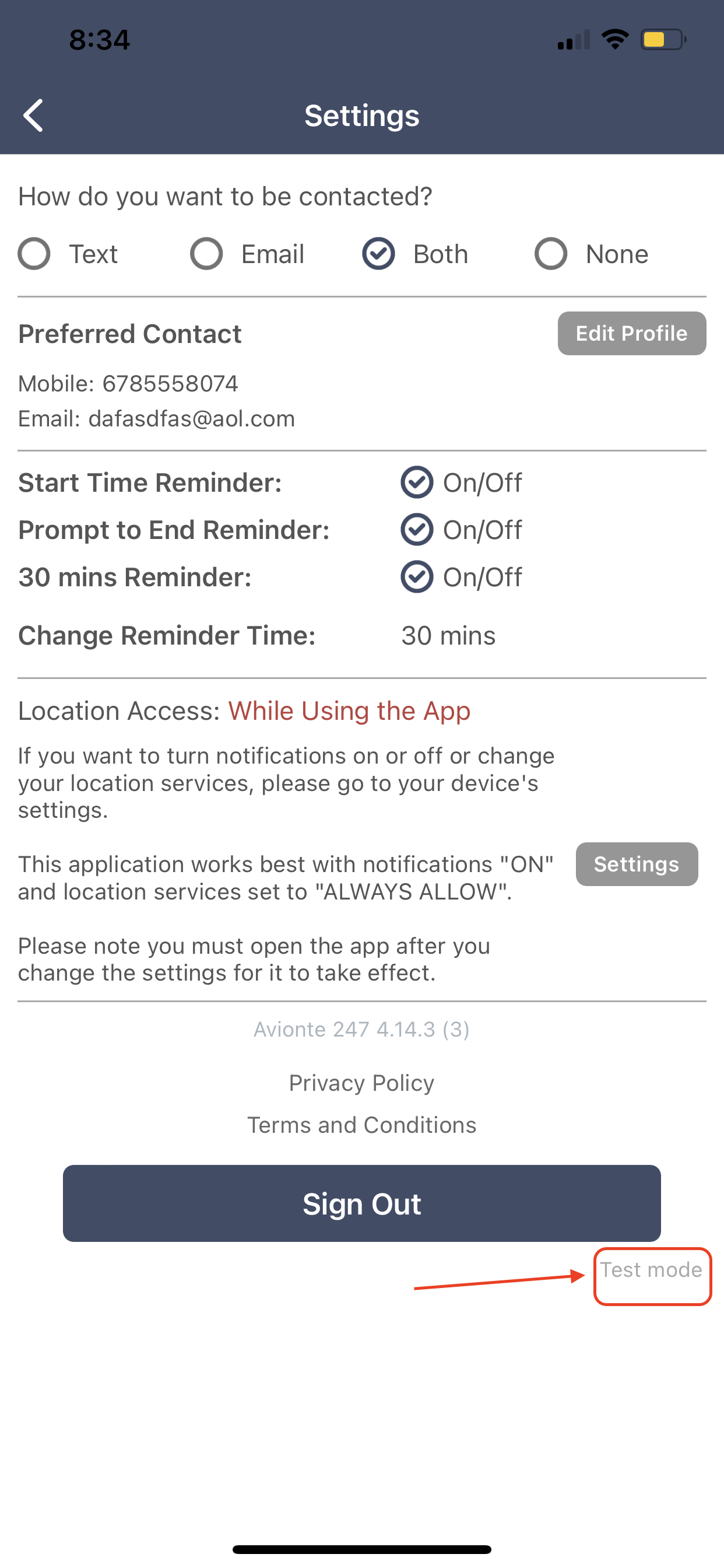 Tap the words 'Test Mode' written in tiny gray letters under the "Sign Out" button in the lower right corner