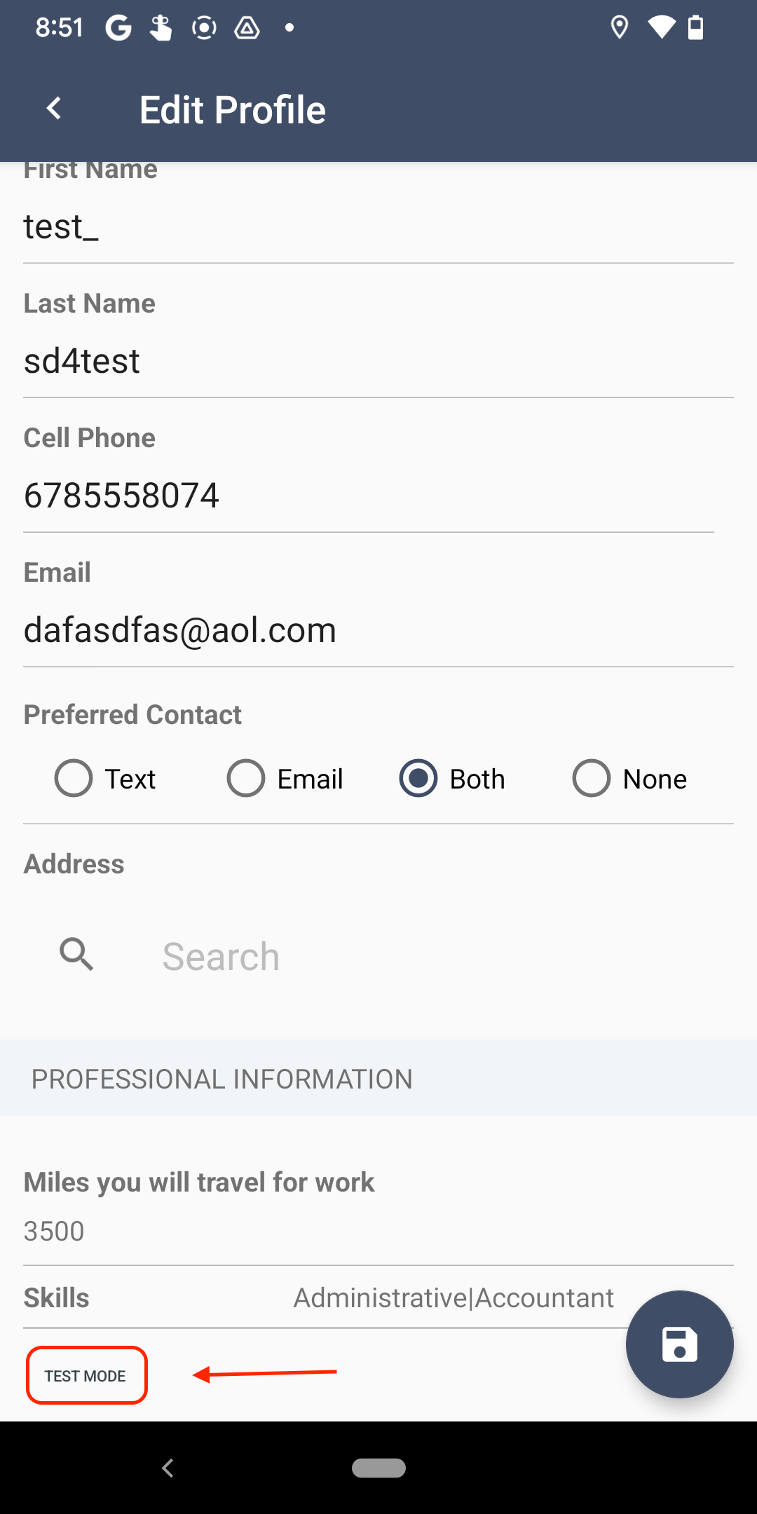 Your WorkN app will connect to either your Production Environment or your Development Environment depending on whether it is in Production mode or Test mode. By default the app will be in production mode and you will need to switch to test mode.