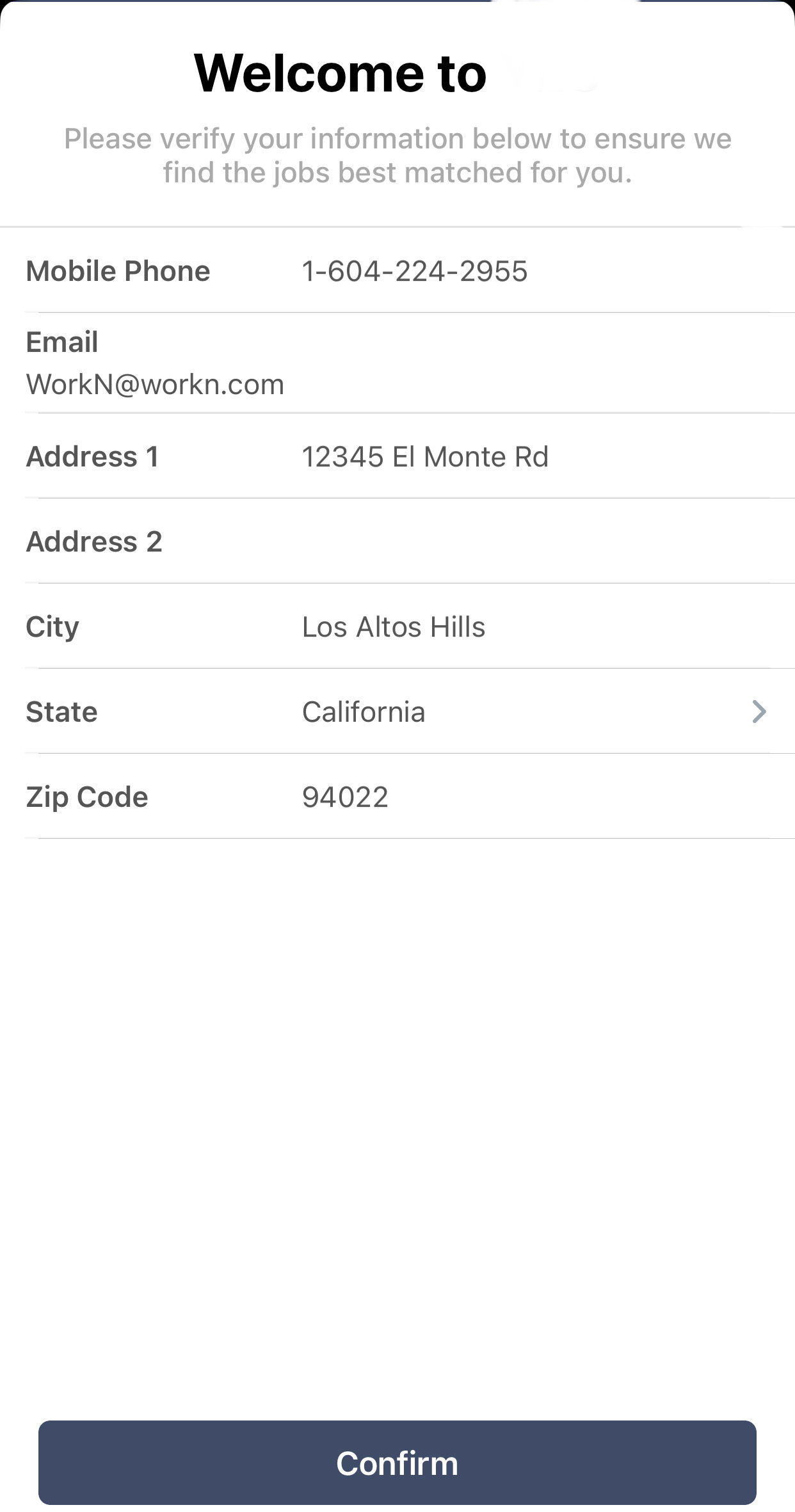 On the first and only the first time a worker logs into your application, the Welcome Page will appear, asking your talent to verify their profile information. This ensures any information you currently have in your system is updated to the most recent version of that talent's profile.