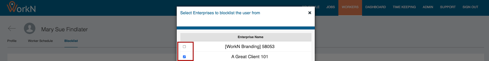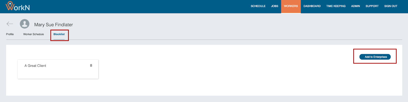 Workers can be blocklisted against enterprises (clients). This functionality can be managed from either the Worker profile or the Enterprise profile on the WorkN front end. Once a worker is blocklisted, they will not receive future job orders from that enterprise, even if they qualify based on matching logic.
