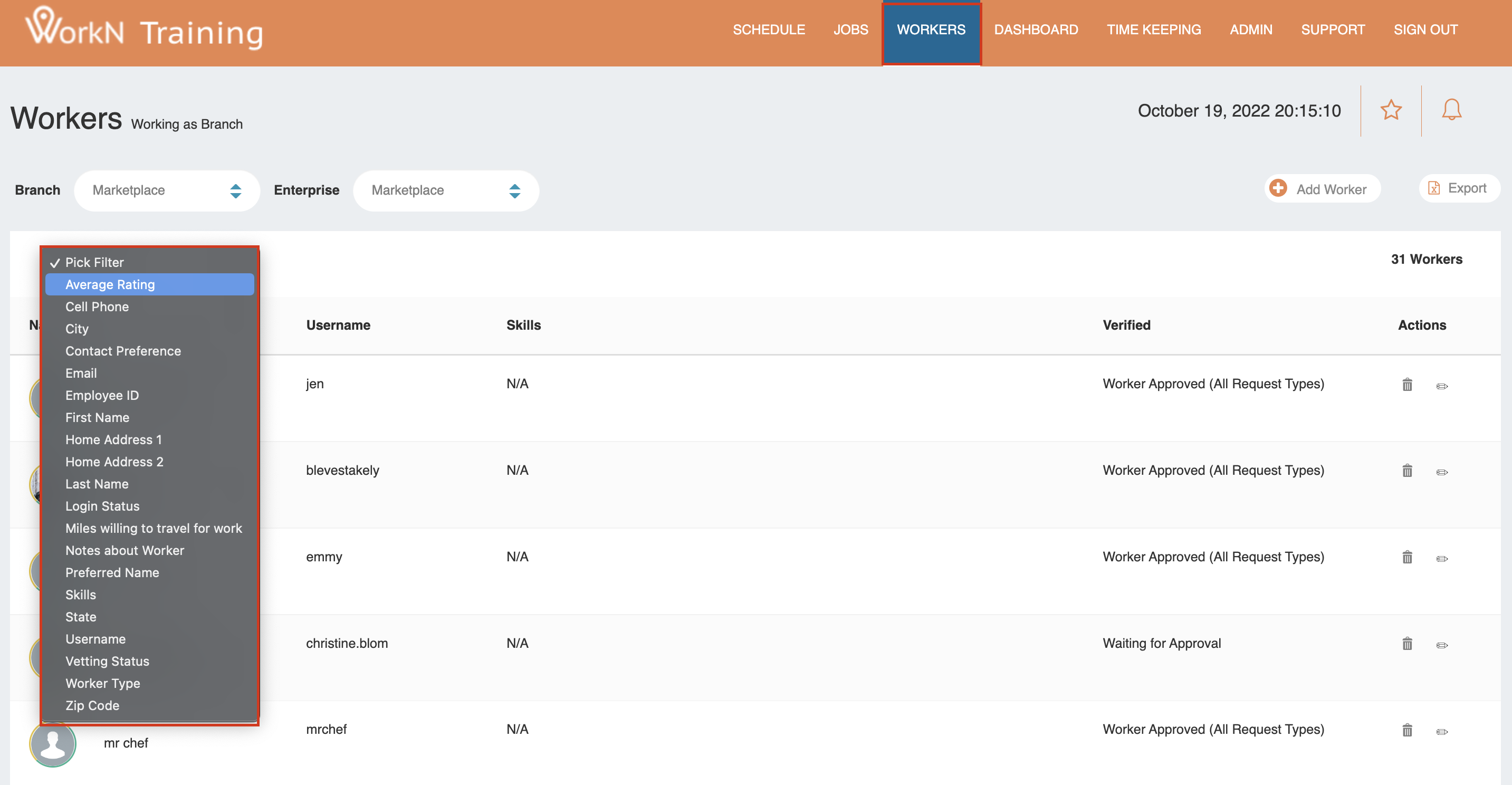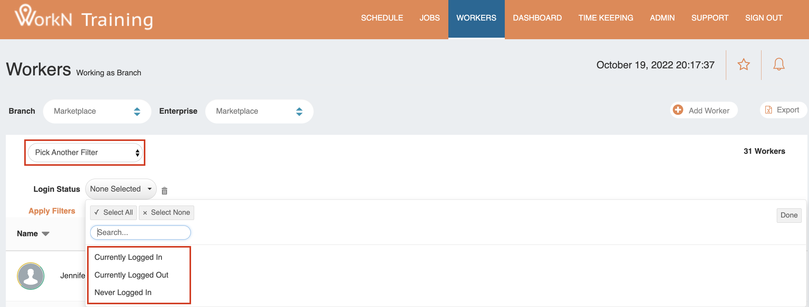 - Login Status Filtering: Identify workers who are currently logged in, logged out, or have never logged in